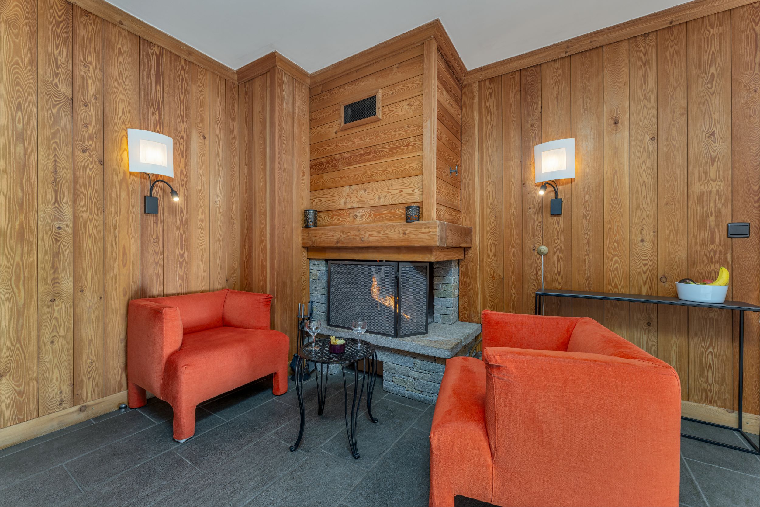 Living Room: Fireplace, TV, sofa, armchairs, access to large sunny terrasse with outdoor furniture